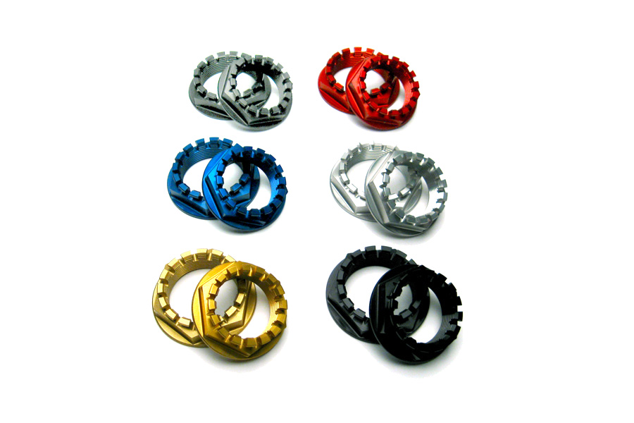 The nut set is crafted 'Made In Germany' from single billets to ensure superior tensile strength over the OEM rear axle nuts. Not only are these strong alloy rear sprocket axle nuts lighter than the stock parts, the design is outstanding. These rear axle wheel nuts set is truly an upgrade of precision engineering.which has been anodised in a long lasting electrolytic passivation processed coating which brings out the beauty of the raw alloy. Various colors avaiable.
