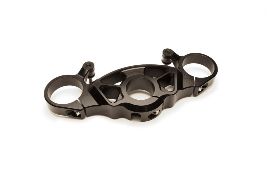Optisch ansprechende und filigrane, durchbrochene Gabelbrücke für die Verwendung eines Stummellenkers an den Ducati Monster Modellen. Aus hochfestem Aluminium (7075) gefertigt und hochwertig eloxiert.