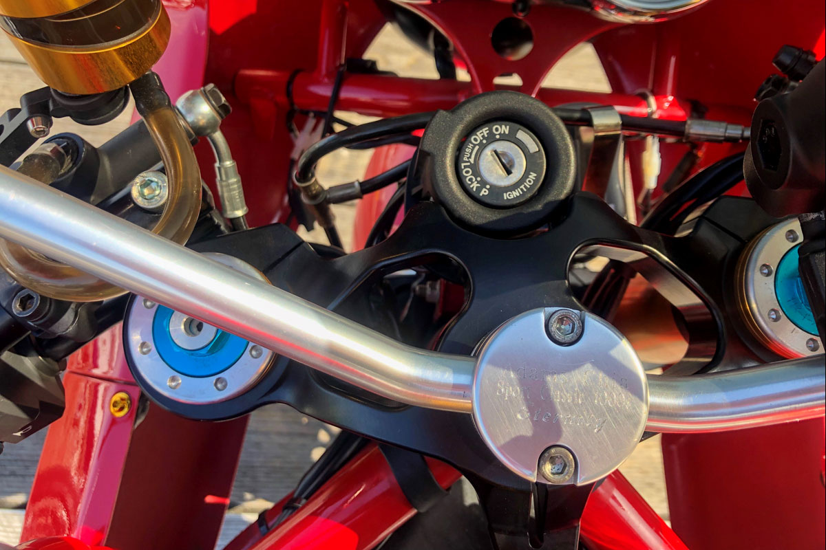 Das edele, auf das Gesamtbild der Duc angepaßtes Design und die volle Funktionalität mit Aufnahme für das Lenkschloss machen diese Gabelbrücke zu einem Hingucker auf jeder Ducati Sport Classic. Die original Steuerkopfmutter kann weiter verwendet werden. Alternativ gibt es unsere, in diversen Eloxalfarben erhältlliche Aluminium Steuerkopfmutter. Siehe Reiter Zubehör.
