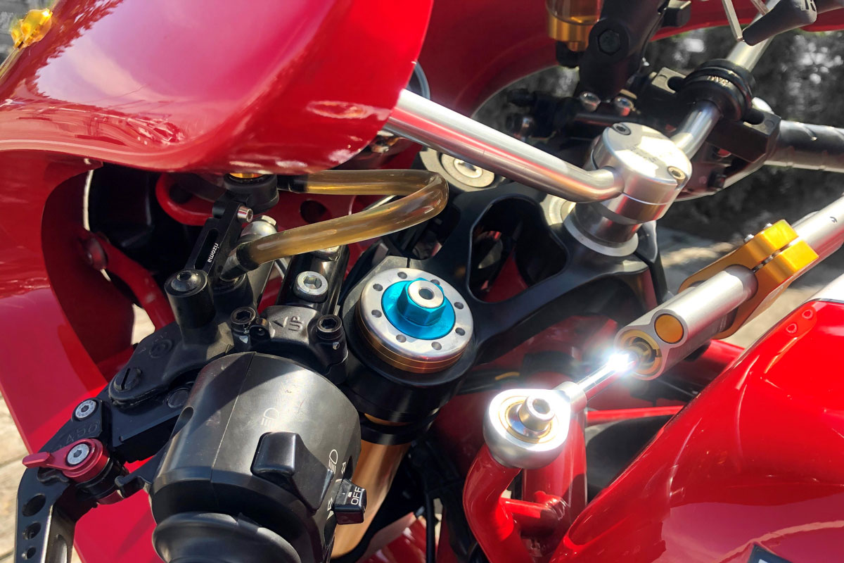 Spezialwerkzeug zum Einstellen der Lenkkopfmutter bei allen Ducati Modellen mit 8-Loch Lenkkopfmutter. Betätigung mit handelsüblichem 1/2 Zoll Innenvierkant. CNC gefräst aus extrem zähen und hochfesten 7075 T6 Konstruktionsaluminium. Passend für alle geschlitzten Lenkkopfmuttern der Ducati Superbikes 748-1198-1199-1299, ST, Sport/GT1000, Monster from 2002, Monster 696/ 1100, Multistrada, Streetfighter, Scrambler 800, Diavel, Hypermotard u.v.m. Nicht passend für Panigale V4 · Gefertigt aus hochfestem Aluminium 7075 T6 · hochwertig titan oberflächeneloxiert · 1/2 Zoll Innenvierkant · Made in Germany · 5 Jahre Garantie