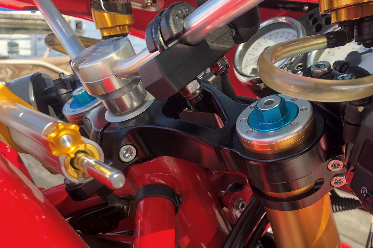 Aus dem Vollen aufwändig gefäste, leicht gekröpfte obere Gabelbrücke für die Ducati SportClassic 1000.