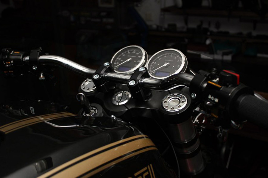 Verschraubung an der Gabelbrücke mit M10 Schrauben. Verschraubung an der Unterseite des Lenkerbocks, d.h. es ist nicht nötig, die Böcke vor der Montage des Lenkers auszurichten.