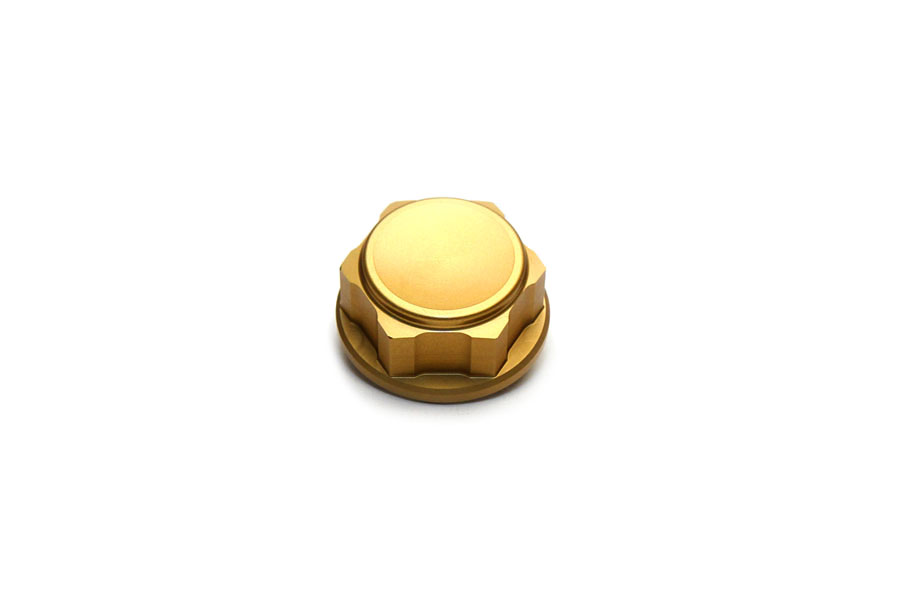 Formschöne, geschlossene Lenkkopfmutter aus Aluminium.