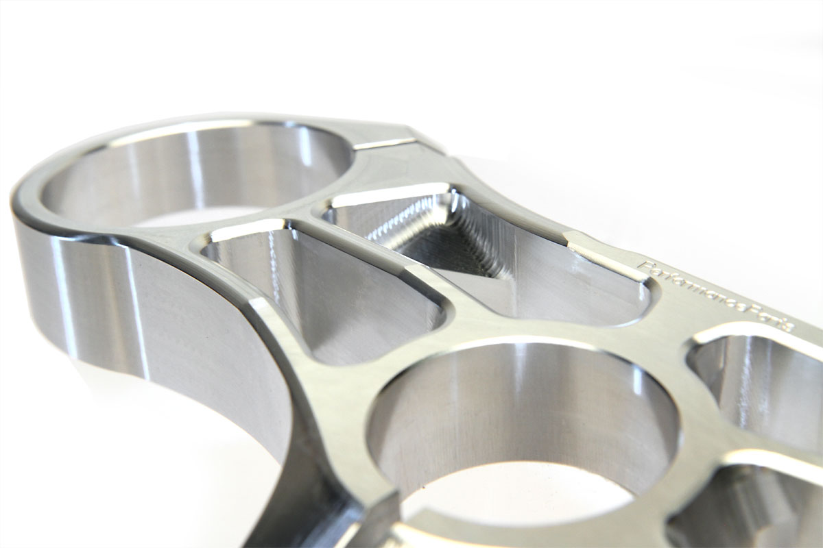 Das auffällige Design und ein hochwertiges Finish dieser Performanceparts Gabelbrücke verleihen der MV ein indivudelles Aussehen. Das offen gestaltete Design erlaubt den freien Blick auf den Lenkkopf und verringert das Gewicht der Brücke auf ein Minimum ohne die Festigkeit zu beeinflussen. Das edle, auf das Gesamtbild der F4 angepasstes Design und die volle Funktionalität mit Aufnahme für den Lenkungsdämpfer machen diese Gabelbrücke zu einem Hingucker auf jeder MV Agusta.